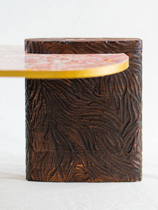Cette table a été designée afin de combiner différents acteurs de l'économie circulaire. Le plateau peut être fait de terrazzo de tissu, créé par Nathan Efflame ou de marbre de coquillage, un matériaux créé par Atelier PUMM.