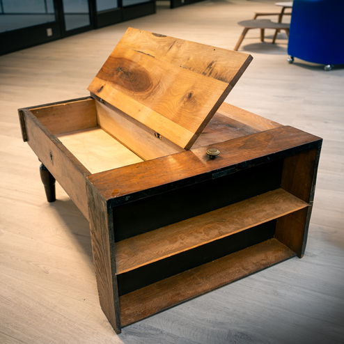 Matériaux : tiroir et meubles détournés de Emmaüs, chutes de plaquages pour la fabrication de panneau, panneau de contreplaqué issu de l'industrie nautique, accoudoir en bois